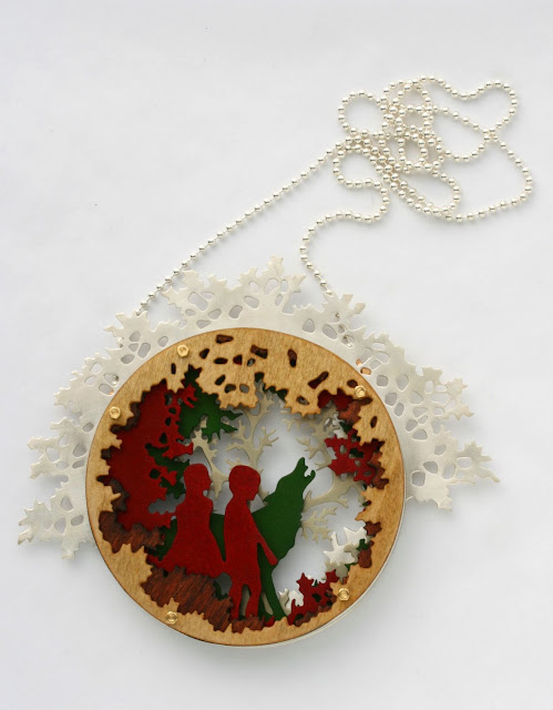 “Hans & Grethe”, Necklace. Anodised aluminium, brass, varnished wood veneer, silver,brass screws and steel pin. – Anna Talbot