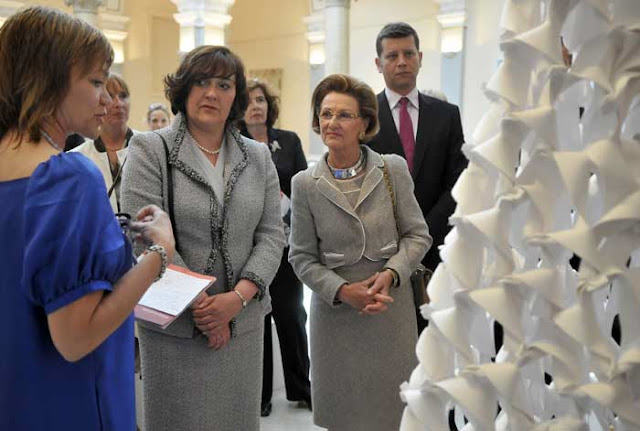 Queen Sonja and The First Lady of Croatia listening to my presentation of the work “White Dress”, made of shirt collars buttoned together, by Marit Akslen.